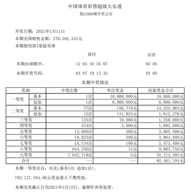 北京时间01月11日晚,体彩大乐透第21005期开奖,当期开奖号码为:前区03 07 10 12 35,后区03 05。